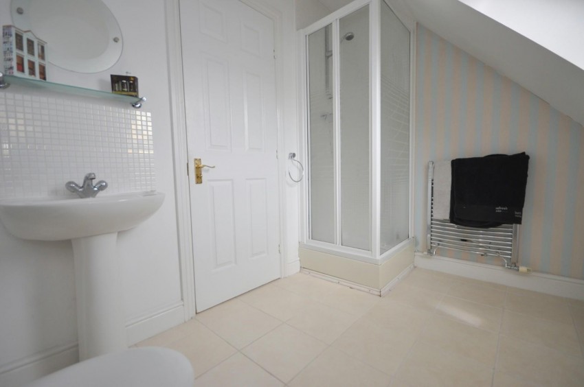 Double glazed Velux window to rear aspect, shower cubicle tiled floor to ceiling, pedestal wash hand basin with close coupled W/C, tiled splash backs, tiled flooring, chrome wall mounted heated towel rail.