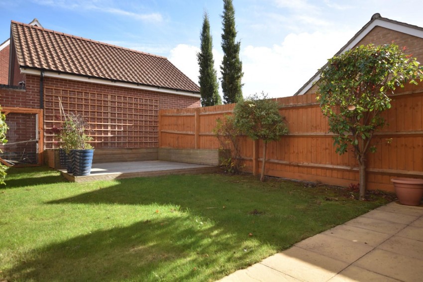 Paved patio area onto lawn, decking area. The rear garden is fully enclosed by timber panel fencing with gated side access and outside cold water tap.