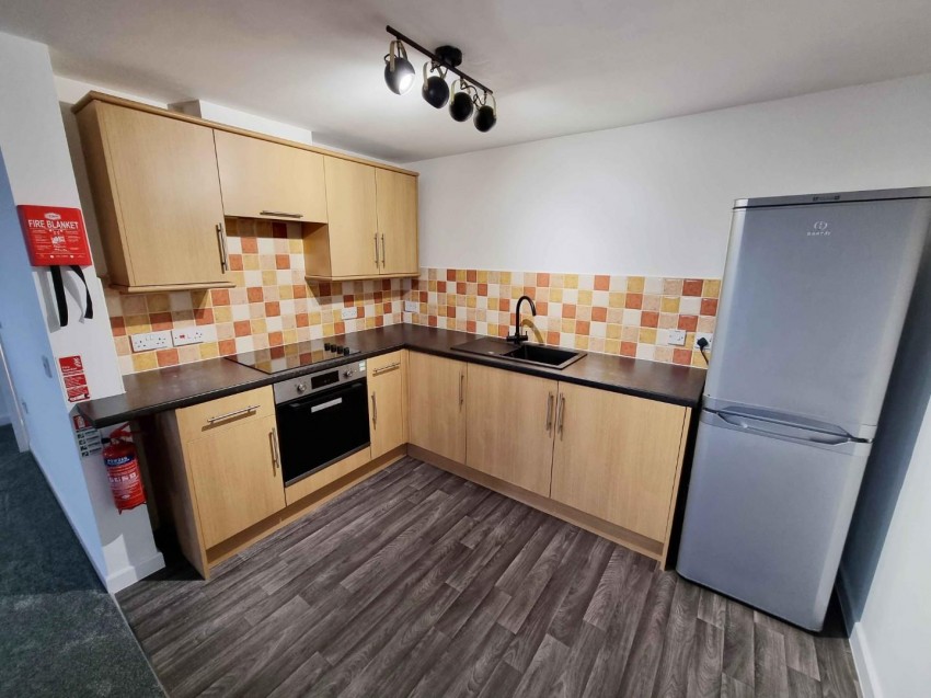 Fitted with a range of base and wall mounted units to incorporate a one and a half bowl stainless steel sink and drainer unit with mixer tap over. Roll top work surfaces with coordinating part tiled walls. Built in electric oven, hob and extractor fan. Fridge / freezer.