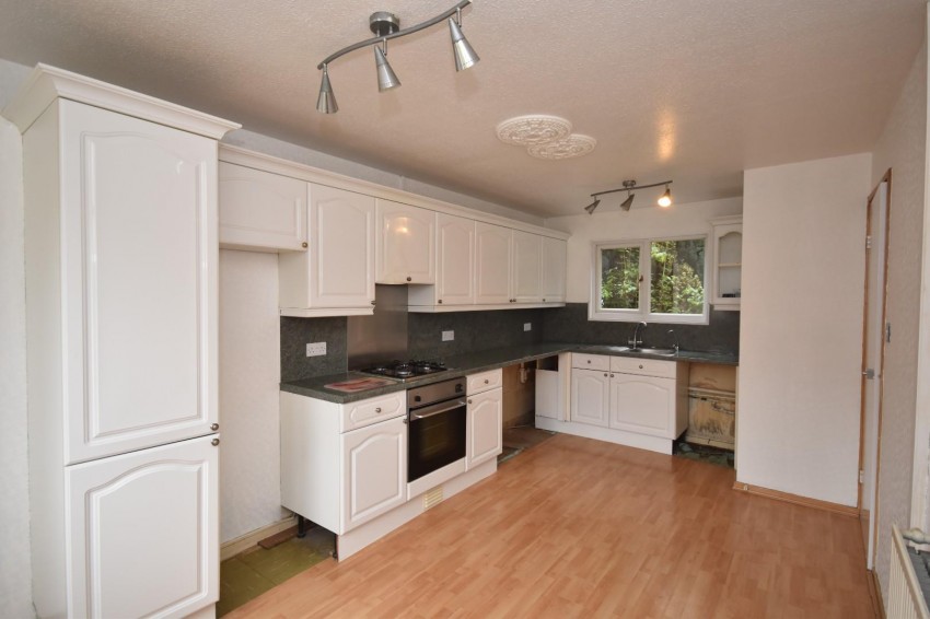 Fitted with white base and wall mounted cupboards, roll edge work surface space, plumbing for washing machine, inset stainless steel sink unit, space for tall standing fridge/freezer, built in single oven, inset gas hob with extractor fan over, laminate flooring, windows to front and rear elevations.