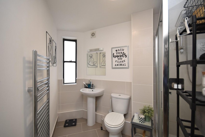 Three-piece white suite of double shower cubicle, pedestal wash hand basin, close coupled WC, heated chrome towel rail, electric shaver point, extractor fan, tiled floor, half tiling to walls and full height tiling to shower area, frosted window to front elevation.