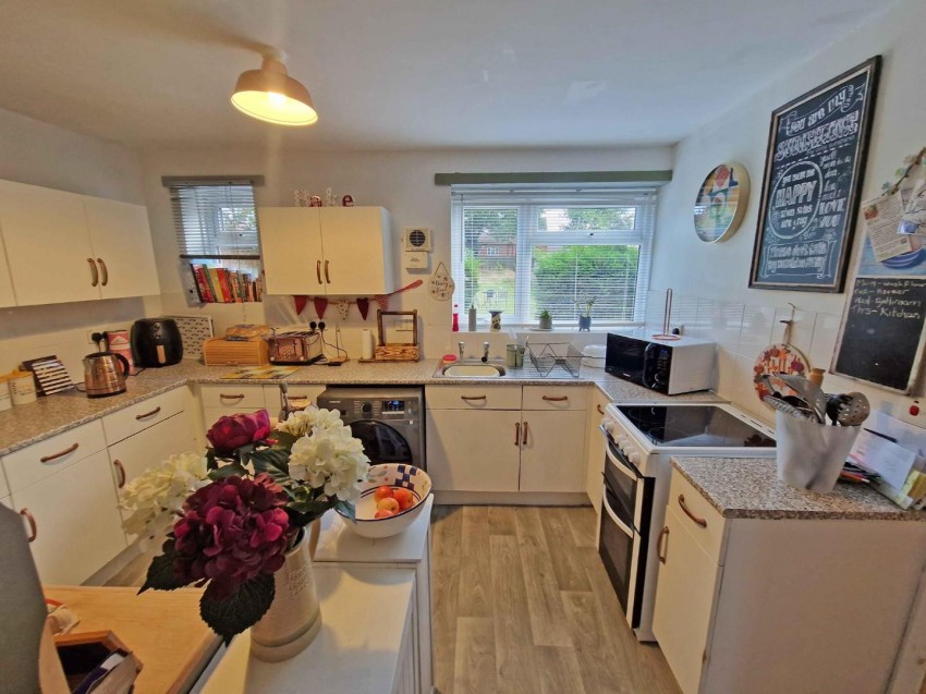 Fitted with a range of base and eye level units. Work surface space incorporating a stainless steel sink and drainer unit. Electric oven. Gas hob. Space and plumbing for a washing machine. Two windows to rear aspect. Glazed timber door to: