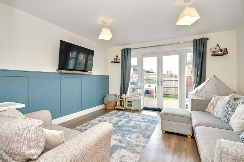 A bright and spacious living area with double doors and side windows leading to the landscaped rear garden. Additional features include a TV point, a radiator, and stylish panelled walls, creating a modern and inviting space.