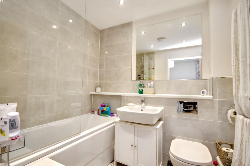 A well appointed family bathroom comprising a low level WC, a wash hand basin, and a side panelled bath with a shower over and a glass shower screen. The bath and shower area are fully tiled, with a radiator completing the space.