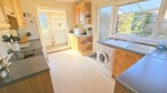 Fitted kitchen comprising sink unit with base cupboard below, a range of floor standing cupboards with work tops above, tiling above work surfaces, eye level cupboards, cooker point, plumbing for washing machine, radiator, UPVC double glazed window to side, UPVC double glazed door to side, door to: