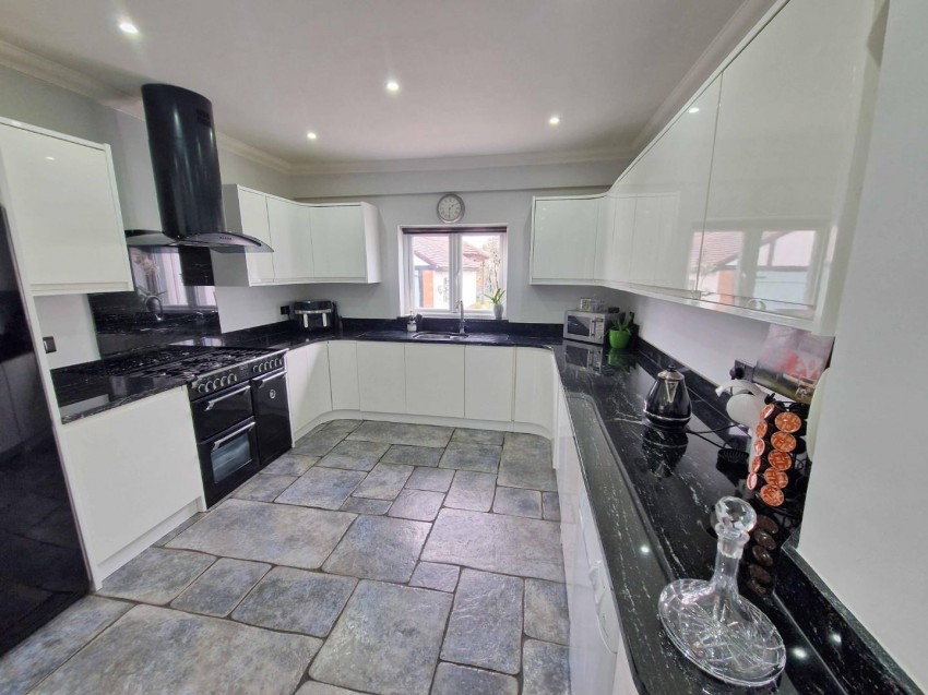 Fitted with a range of base and eye level units. Granite work surface space incorporating a sink and drainer unit with mixer tap over. Range cooker with extractor over. Integrated washing machine and dishwasher. Space for a tumble dryer. Space for a fridge/freezer. Radiator. Shoe store. Window to rear. Door to side.