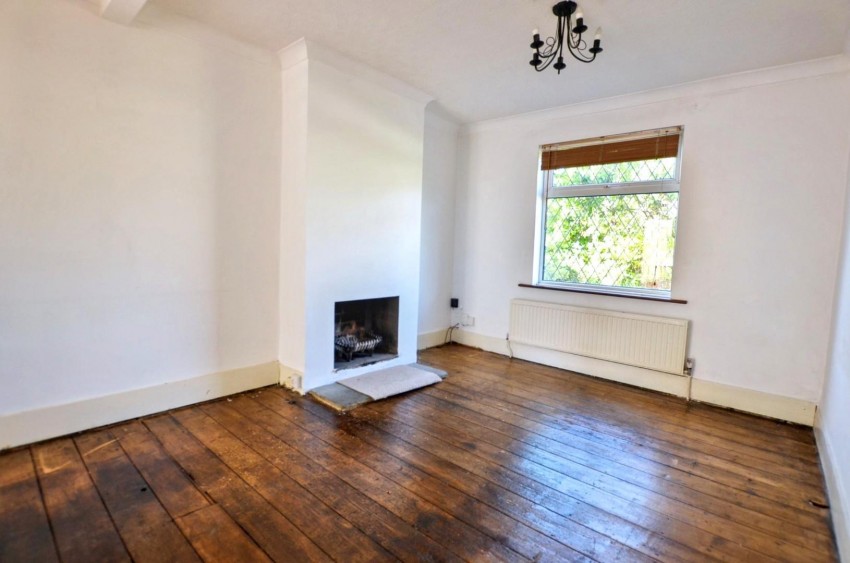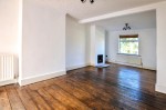 Stripped wood flooring, fireplace with recesses to side of chimney breast, two double panel radiators, door to cellar, window to front elevation, sliding patio doors to conservatory. door to cellar.